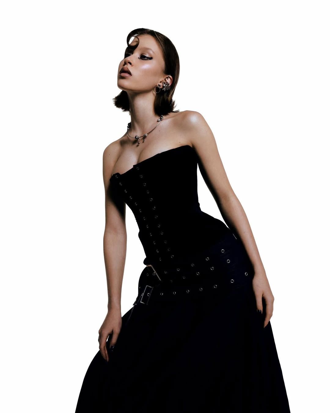 Стилисты уложили волосы звезды сериала «Слово пацана. Кровь на асфальте» в прическу с эффектом мокрых волос. Образ дополнило колье с шипами. Визажистом в данной съемке выступила Рина Землюзина.