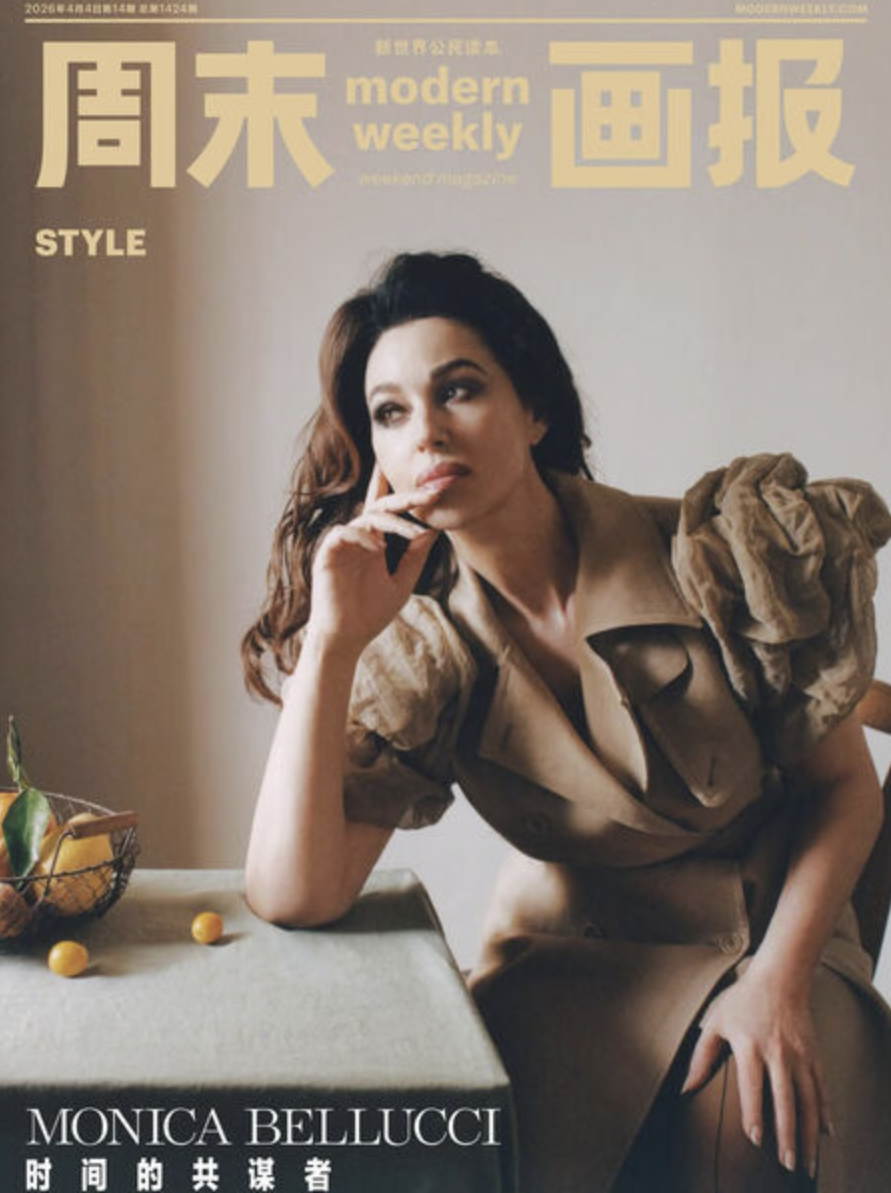 61-летняя Моника Беллуччи стала героиней нового выпуска журнала Modern Weekly Style. На обложке актриса предстала в коричневом платье с объемными рукавами и разрезом до бедра и черных колготках. Артистка позировала с уложенными распущенными волосами и макияжем с черными тенями и помадой. Знаменитость снялась, сидя за столом.