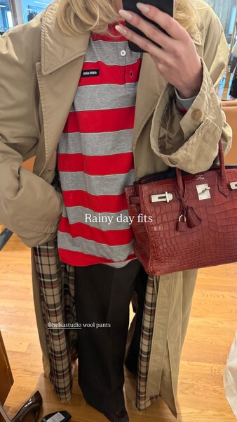 Эльза Хоск позировала в полосатом поло, черных брюках и бежевом тренче. Образ дополнила красная сумка Birkin из кожи под крокодила от бренда Hermes, стоимость которой составляет от 2-х миллионов рублей.