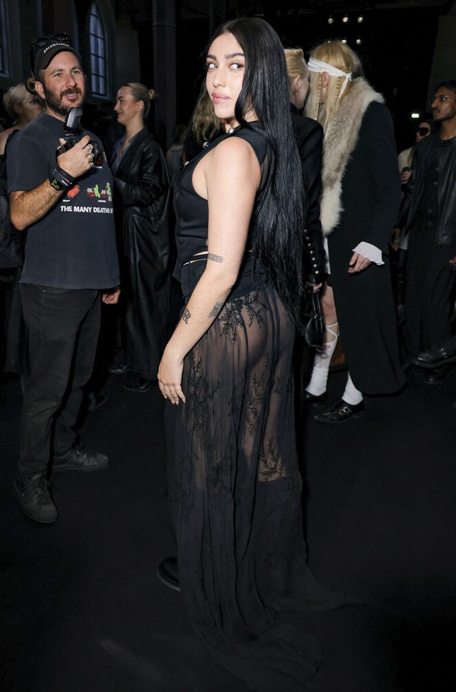 29-летняя Лурдес Леон посетила показ новой коллекции дизайнера Анн Демельмейстер, который состоялся 7 марта в рамках Недели моды в Париже. Для выхода на публику дочь Мадонны предпочла черное платье с корсетом, украшенным заклепками, и прозрачной юбкой. Певица также надела стринги в тон и ботинки. Знаменитость позировала перед фотографами с распущенными волосами и макияжем в естественном стиле.