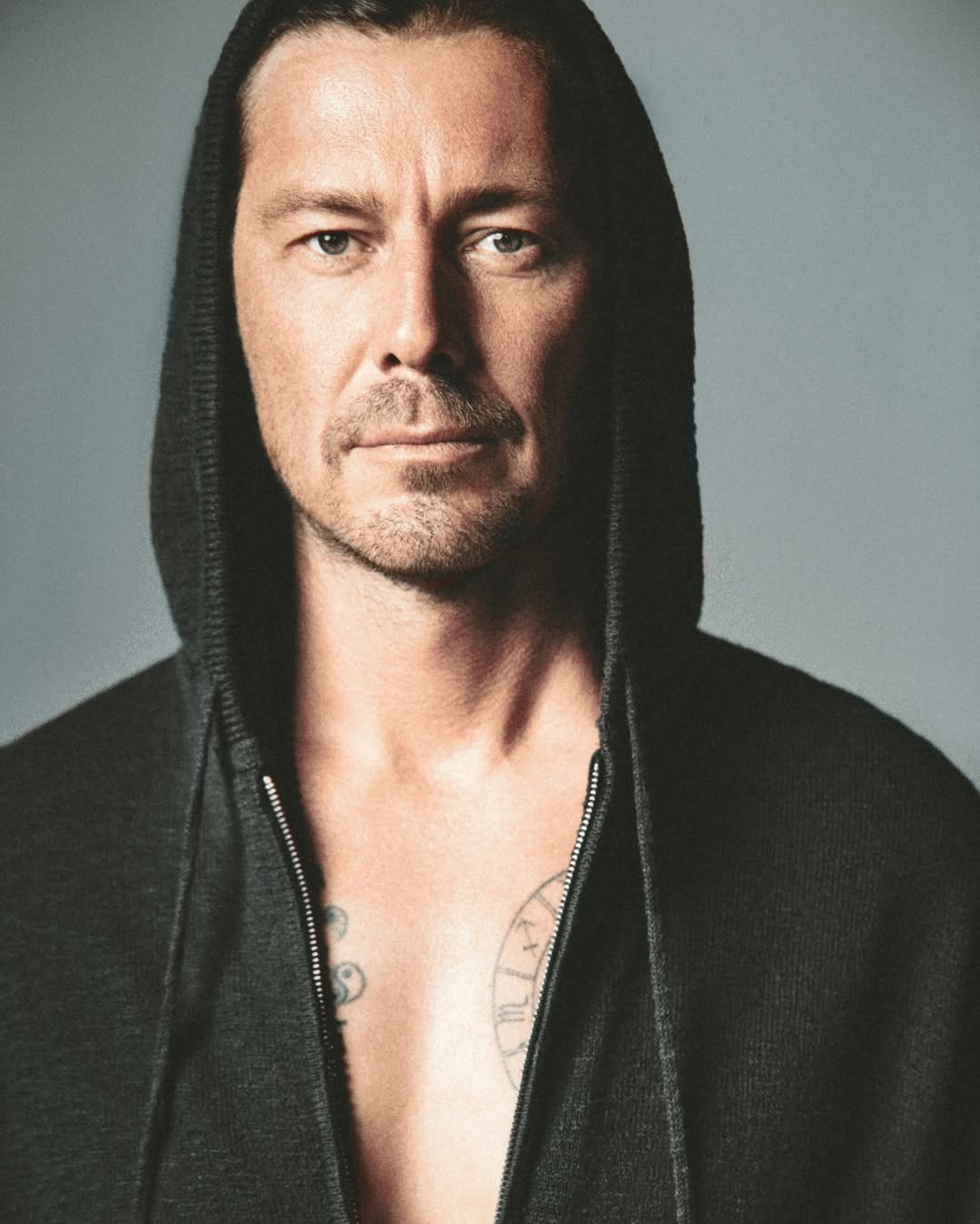 46-летний спортсмен предстал перед камерой в черной толстовке. При этом он надел на голову капюшон и расстегнул молнию на груди, а также дополнил образ браслетами и ожерельем.