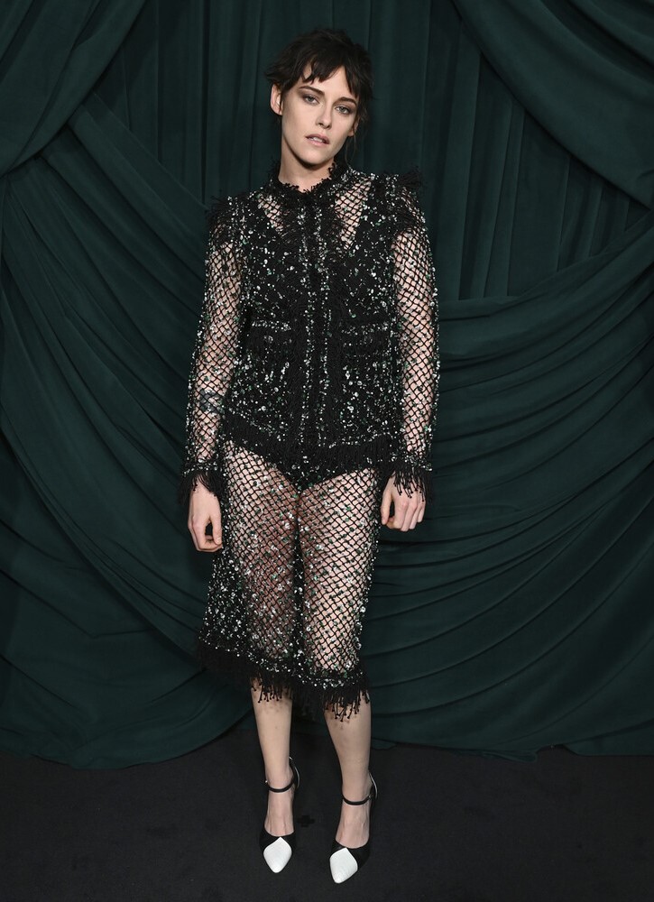 35-летняя Кристен Стюарт посетила 17-й ежегодный ужин Chanel, приуроченный к церемонии вручения премии «Оскар». Актриса выбрала для закрытого мероприятия черный прозрачный костюм, который состоял из жакета и юбки. Артистка дополнила образ боди и туфлями на каблуках.