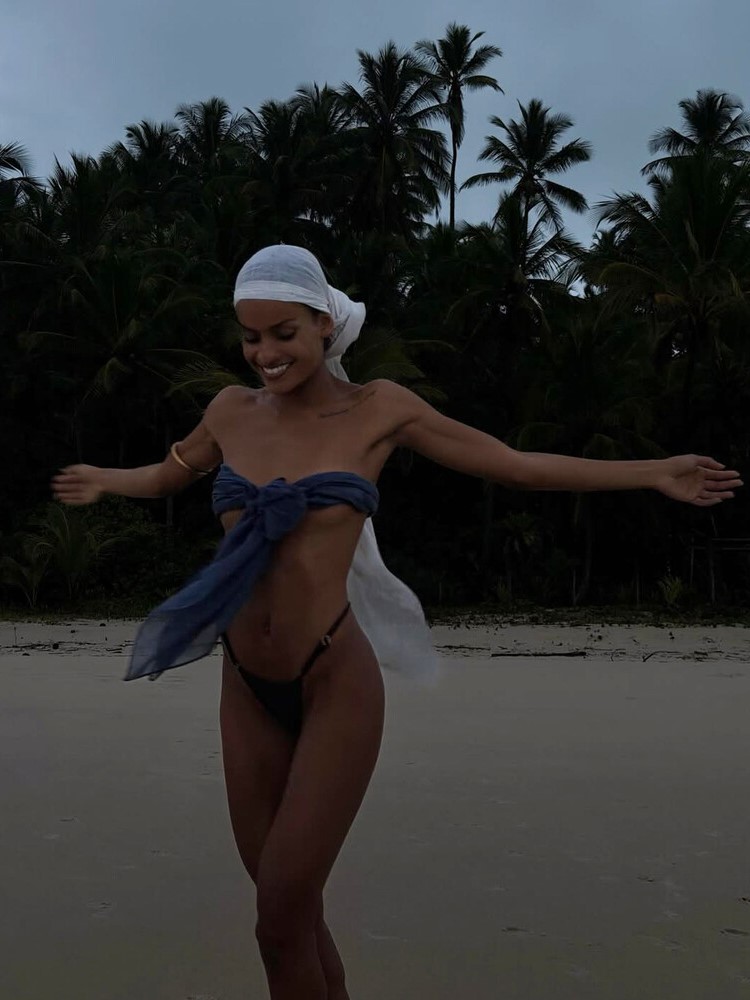 29-летняя Нара Баптиста позировала перед камерой в темно-синем крошечном бикини, которое дополнила белым платком на голову. Модель также надела золотой массивный браслет. Манекенщица предстала в кадре без косметики. Знаменитость была запечатлена на пляже на фоне пальм.