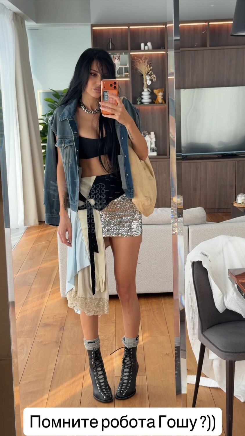37-летняя Оксана Самойлова стояла перед зеркалом в черном бюстгальтере, который сочетала с джинсовой курткой, блестящей серебристой мини-юбкой и кожаными ботильонами на каблуках. Модель добавила к образу массивную цепь, шопер и серые носки. Блогерша позировала с распущенными волосами и макияжем с черными стрелками и темно-розовой помадой.
