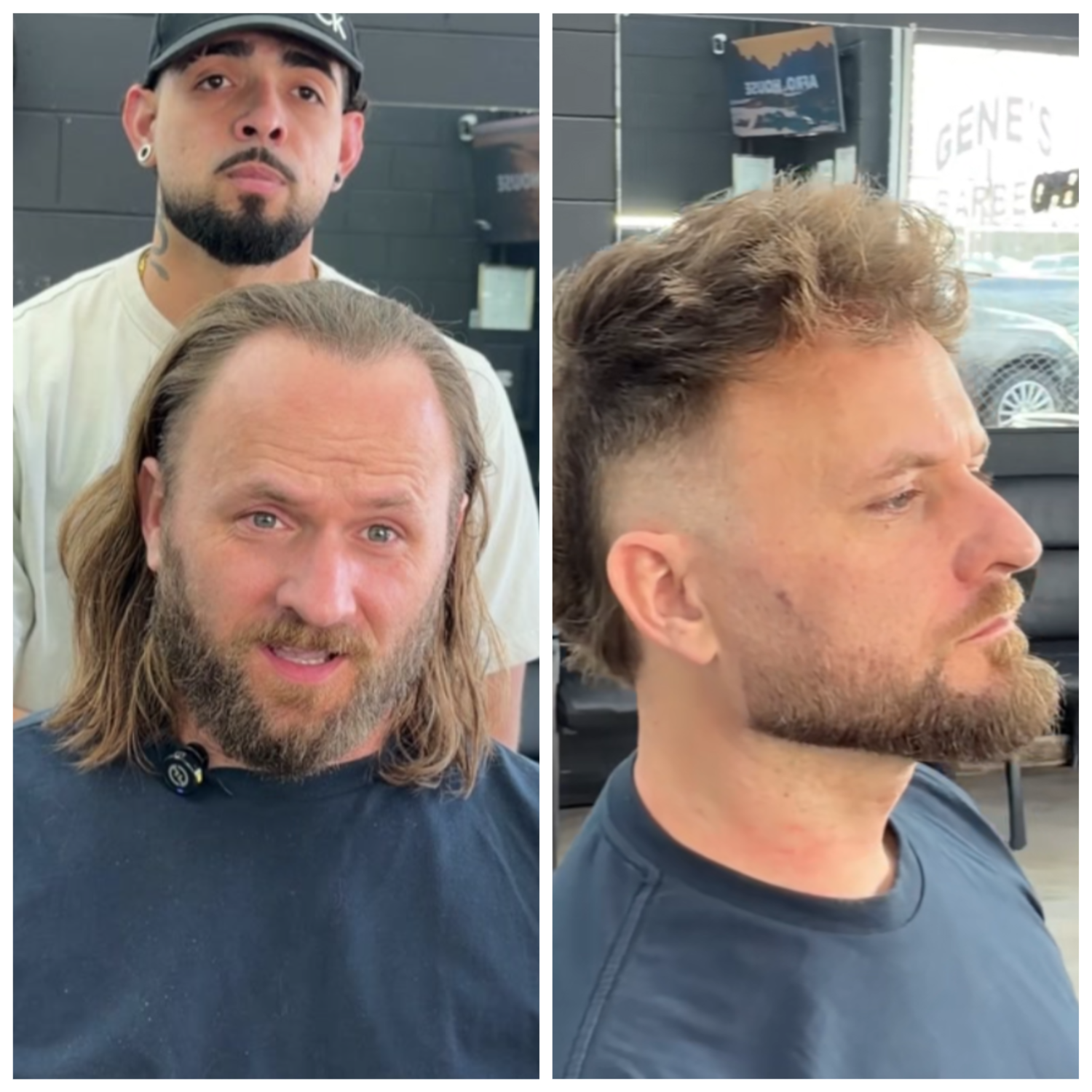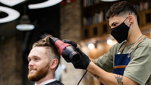 Вначале мужчина предстал перед камерой с волосами до плеч, залысинами на лбу и отросшей бородой и усами. Затем специалист преобразил посетителя. Он сделал ему прикрывающую лоб короткую стрижку с выбритыми висками и придал четкую форму растительности на лице.