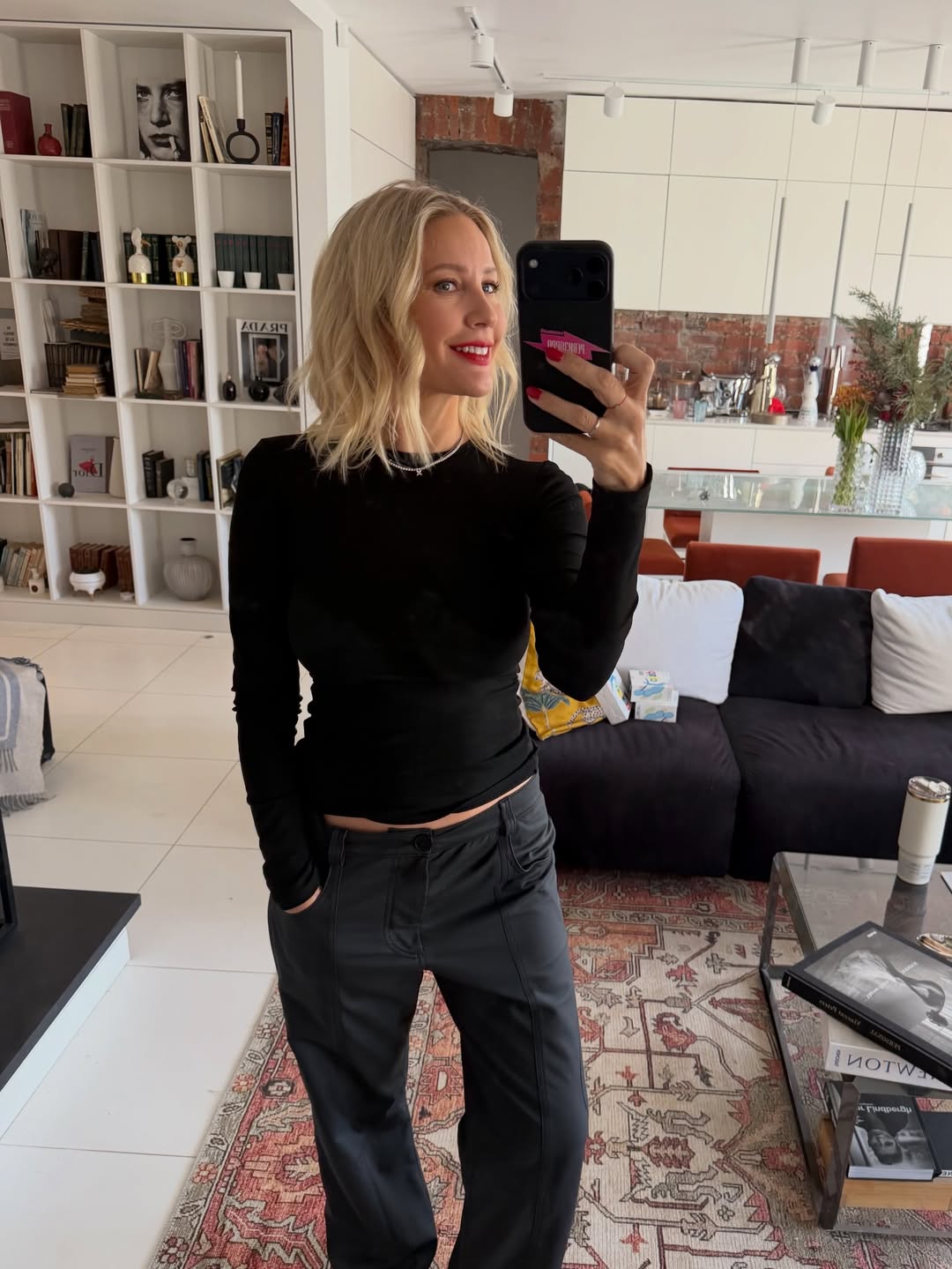 Елена Летучая позировала в кожаных брюках и лонгсливе. Волосы ведущей уложили мягкими локонами и сделали вечерний макияж с красной помадой. Съемку она устроила в домашнем интерьере. Только недавно ведущая сменила имидж — отстригла каре.
