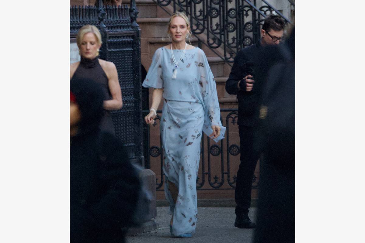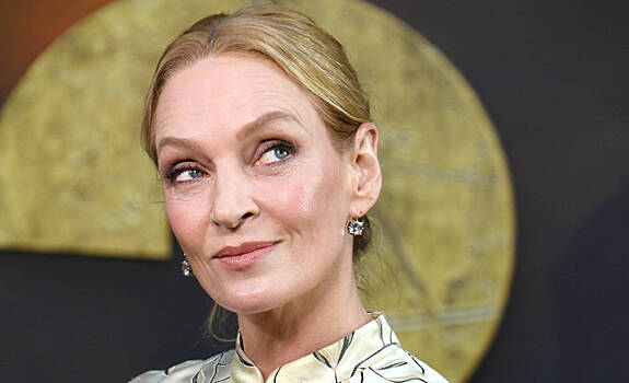 Помимо этого, знаменитость надела синие туфли, белое ожерелье с кисточками и серьги-кольца. Волосы Турман были собраны в легкую прическу, которая подчеркивала образ.