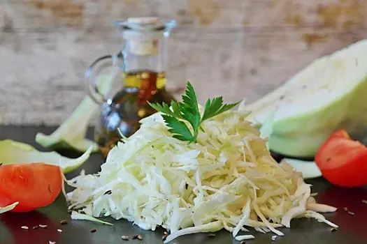 В тарелке обязательно раскрошите сверху фету (или обычную брынзу) и киньте пару оливок. Если есть лимон — выжмите каплю сока прямо в тарелку, это идеально оттеняет сладость капусты.