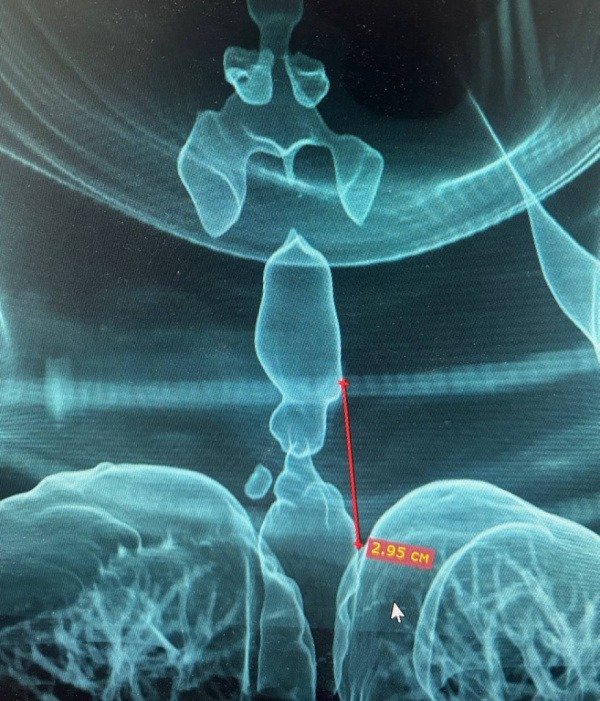 Диагностика показала — рубцовое сужение. Чтобы не ошибиться, хирурги сделали 3D-модель дыхательных путей — так увидели точные границы пораженного участка. Трахея сузилась до 5 мм.