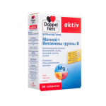 Комплекс биологически активных веществ, несущих силу, энергию, повышающих защитные силы организма и работоспособность.Рекомендован при повышенных нервных и физических нагрузках, способствует улучшению самочувствия.Дополнительный источник витаминов группы В, фолиевой кислоты, магния.Кому рекомендован прием Доппельгерц актив Магний + Витамины группы B?Микроэлемент магний важен для энергоснабжения клеток, обменных процессов, стабилизации работы сердечной мышцы. Он принимает участие в процессе нервно-мышечного возбуждения. В тоже время в организме он содержится в крайне малых количествах. Витамин B6 используют в лечении неврологических расстройств, нарушении внимания, при депрессиях. Витамин В1 участвует в обменных процессах и поддерживает нормальную деятельность нервной системы. Витамин B12 применяется для лечения и профилактики анемии, защищает от развития инфаркта и инсульта, нормализует работу нервной системы.Таким образом, данный комплекс рекомендован людям, испытывающим дефицит магния, который сопровождается следующими симптомами:Усталость, вялость, низкий уровень энергии.Повышенная нервозность.Синдром хронической усталости.Активные компонент:Магний 400 мг.Витамин B1 4,2 мг.Витамин B6 5 мг.Витамин B12 5 мкг.Фолиевая кислота 600 мкг.Рекомендации по применению:*- не превышает верхний допустимый уровень потребления .Взрослым один раз в день по 1 таблетке во время еды с большим количеством жидкости, не разжевывая. Продолжительность приема не более 2 месяцев.Перед применением необходимо проконсультироваться с врачом.Противопоказания: индивидуальная непереносимость компонентов продуктов, беременность, кормление грудью.Состав:Магния оксид (магний), целлюлоза микрокристаллическая (эмульгатор Е 460i), кроскармеллоза (стабилизатор Е 468), диоксид кремния аморфный (агент антислеживающий Е 551), раствор шеллака (шеллак глазирователь Е 904, Твин 80 эмульгатор Е 433), целлюлоза в порошке (эмульгатор Е 460ii), моно- и диглицериды жирных кислот (эмульгатор Е 471), Гидроксипропилметилцеллюлоза (загуститель Е 464), диоксид титана (краситель Е 171), соли кальция жирных кислот (эмульгатор Е 470), пиридоксина гидрохлорид (витамин В6), тиамина нитрат (витамин В1), цианокобаламин (витамин В12), тальк (агент антислеживающий Е 553iii), масло оливковое, фолиевая кислота.