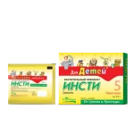 Фармакокинетика Действие препарата Инсти для детей является совокупным действием его компонентов, поэтому проведение фармакокинетических исследований не представляется возможным: все вместе компоненты не могут быть прослежены с помощью маркеров или биоисследований. По этой же причине невозможно обнаружить и метаболиты препарата. Фармакодинамика Инсти для детей, гранулы – комплексный фитопрепарат с отхаркивающим, муколитическим, бронхолитическим, жаропонижающим и спазмолитическим действием. Препарат Инсти для детей ослабляет симптомы интоксикации (гипертермия, потливость, слабость), сопровождающие воспалительные процессы верхних и нижних дыхательных путей, действует антисептически, снижает интенсивность и увеличивает продуктивность кашля. Ива белая содержит гликозиды салицин, тремулацин. Оказывает жаропонижающее, противовоспалительное, болеутоляющее действие. Адхатода сосудистая содержит алкалоиды вазицин, вазицинон. Обладает бронхорасширяющим, отхаркивающим действием, снижает вязкость мокроты и повышает двигательную активность ресничек эпителия бронхов, что способствует улучшению отхождения мокроты. Стимулирует выработку сурфактанта, что обеспечивает дыхательной мускулатуре возможность выполнения полноценного цикла «вдох/выдох». Оказывает противоастматический эффект, защищая от бронхоспазма, вызванного действием гистамина. Фиалка душистая содержит виолин, фриделин, эфирные масла. Оказывает антигистаминное, отхаркивающее, жаропонижающее, потогонное действие. Солодка голая содержит гликозид глицирризин, флавоноиды, аспарагин. Обладает отхаркивающим и противовоспалительным свойствами. Содержание в солодке глицирризиновой кислоты обеспечивает иммуностимулирующее действие, повышая как местный, так и общий иммунитет. Чай китайский содержит танин, кофеин, теофиллин. Обладает вяжущим, тонизирующим, мочегонным действием. Фенхель обыкновенный содержит эфирные масла, дипентин. Усиливает секреторную функцию бронхов и оказывает муколитическое действие, а также обладает антисептическим и противовоспалительным свойствами. Эвкалипт шаровидный содержит эфирные масла (цинеол, пинен, миртенол, пинокарвон, эйдесмол), дубильные вещества. Обладает антисептическим действием, особенно в отношении стрептококков, стафилококков, вызывает противовоспалительный эффект. Стимулирует процессы регенерации, повышает устойчивость тканей к гипоксии. Валериана лекарственная содержит эфирные масла (изовалериановая кислота, валереналь, борнеол, а-пинен), алкалоиды (валериан, хатинин), сапонины, кетоны. Понижает возбудимость центральной нервной системы, уменьшает спазмы гладкомышечных органов. Инсти для детей улучшает состояние пациентов, снижает повышенную температуру и интенсивность кашля. Способствует быстрому устранению симптомов ринита, фарингита, трахеита в течение 24 часов после его применения. Не вызывает сонливости и привыкания. Быстро растворим в горячей воде.